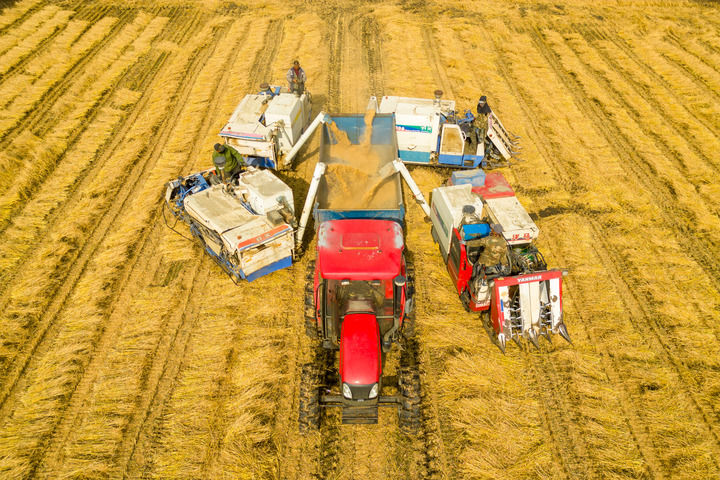 2024年10月13日,在黑龍江省綏化市北林區雙河鎮稻香村,村民駕駛農機進行卸糧作業(無人機照片)。(新華社記者 張濤/攝)