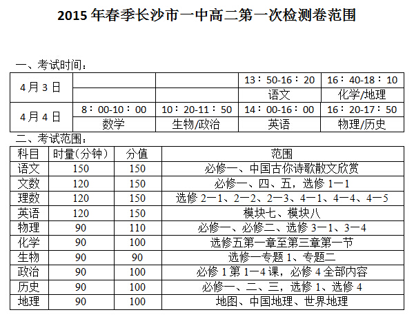 2015年春季長沙市一中高二第1次月考考試時間和范圍(2015.04.03-04)