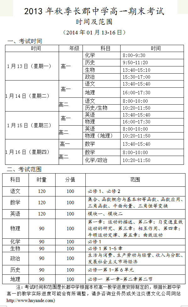2013年秋季長(zhǎng)郡中學(xué)高一期末考試時(shí)間和范圍(2014.01.13-16)