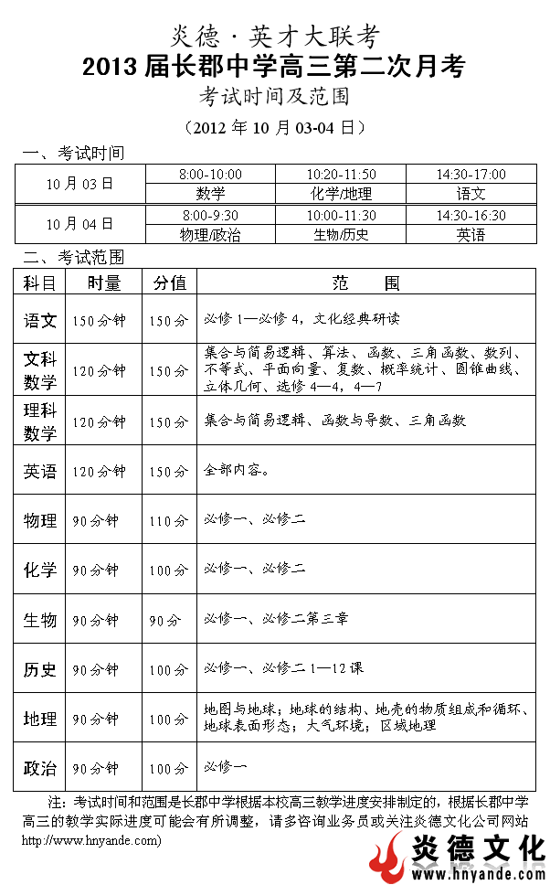 炎德英才大聯考長郡中學2013屆高三第二次月考考試時間和范圍