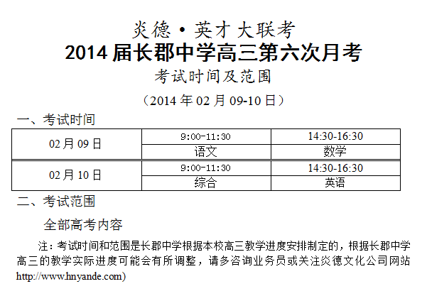 炎德英才大聯(lián)考長郡中學(xué)2014屆高三第6次月考考試時(shí)間和范圍(2014.02.09-10)