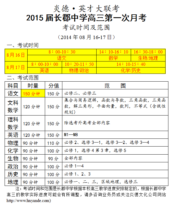 炎德英才大聯(lián)考長郡中學(xué)2015屆高三第1次月考考試時(shí)間和范圍(2014.08.16-17最新)