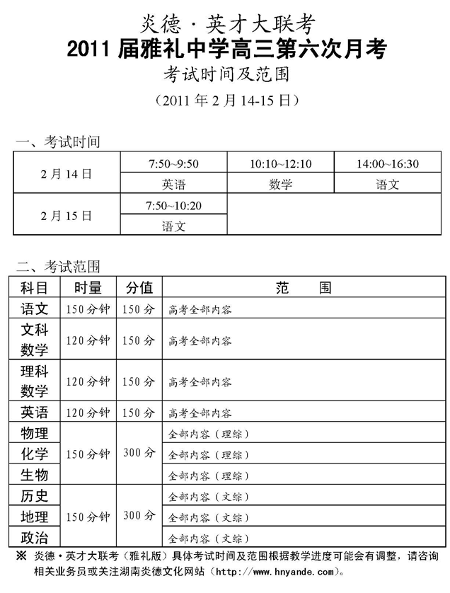 炎德英才大聯考雅禮中學2011屆高三第六次月考考試時間和范圍