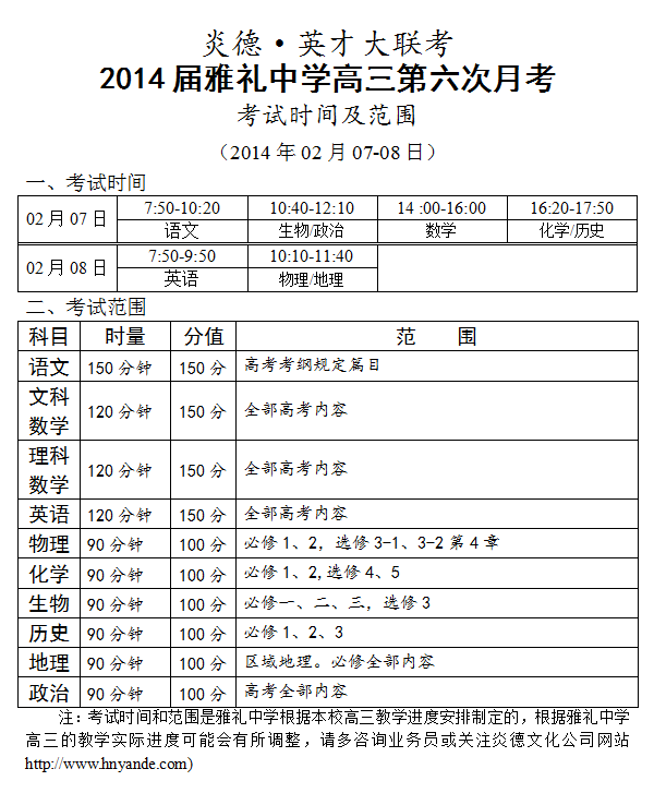 炎德英才大聯考雅禮中學2014屆高三第6次月考考試時間和范圍(2014.02.07-08)