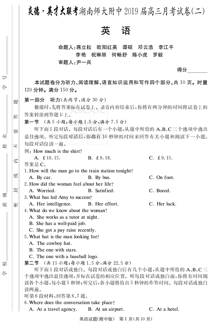 【英語】炎德英才大聯(lián)考2019師大附中高三2次月考