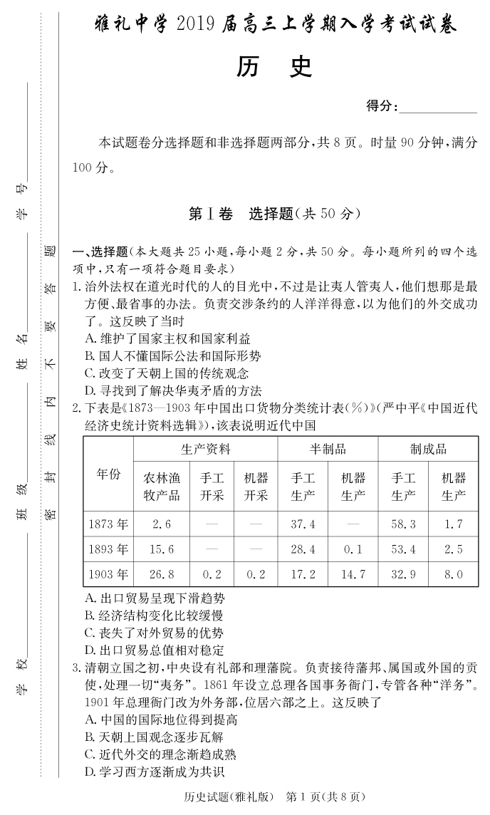 2026湖南師大附中新高考考前小題訓練·歷史