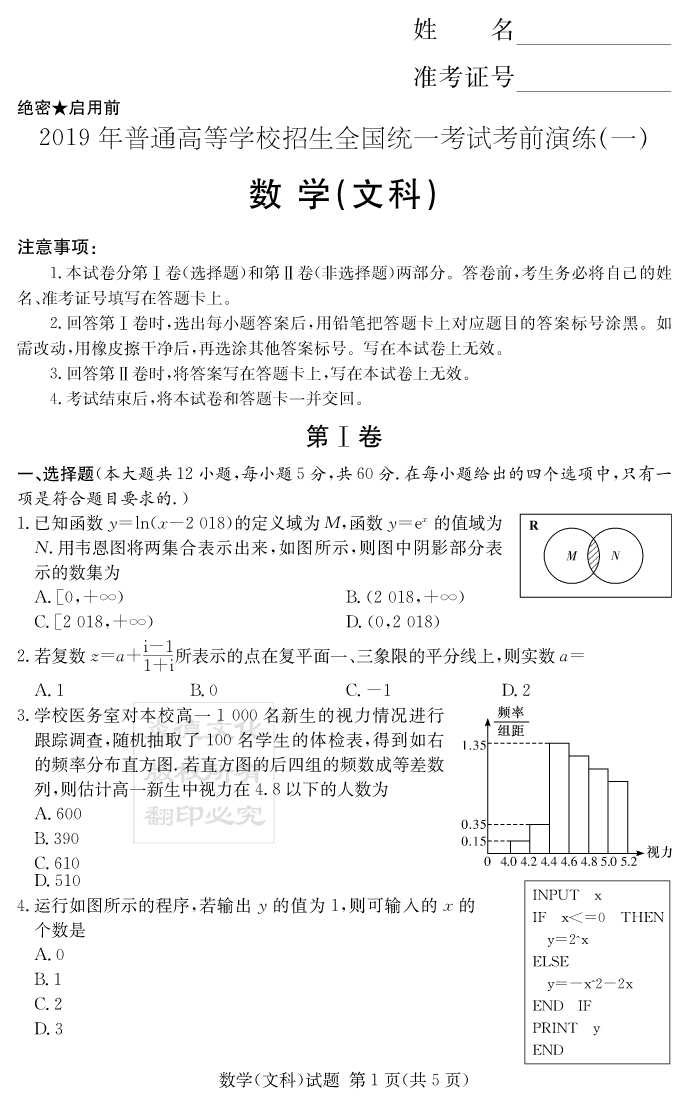 【文數(shù)】2019年普通高等學(xué)校招生全國統(tǒng)一考試考前演練(一)