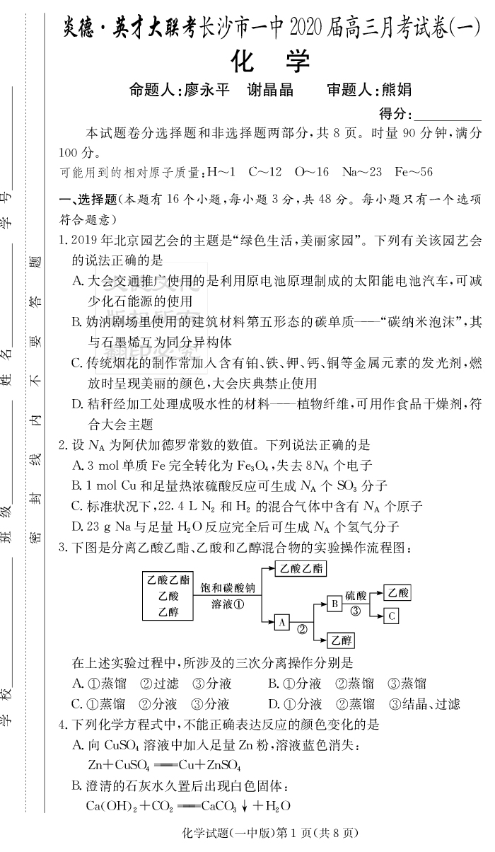 2026湖南師大附中新高考考前小題訓練·化學
