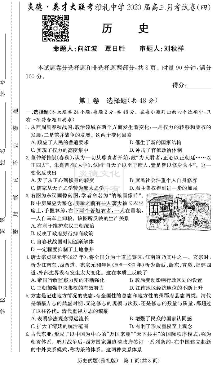 2026湖南師大附中新高考考前小題訓練·歷史