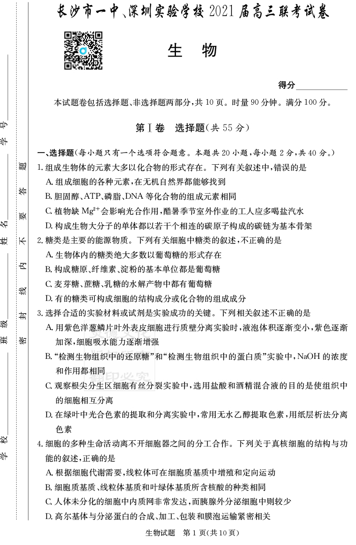 2026湖南師大附中新高考考前小題訓練·生物