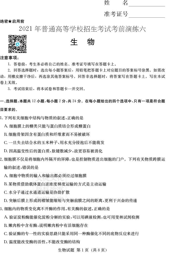 2026年高中寒假作業自主學習作業本·高三年級·生物