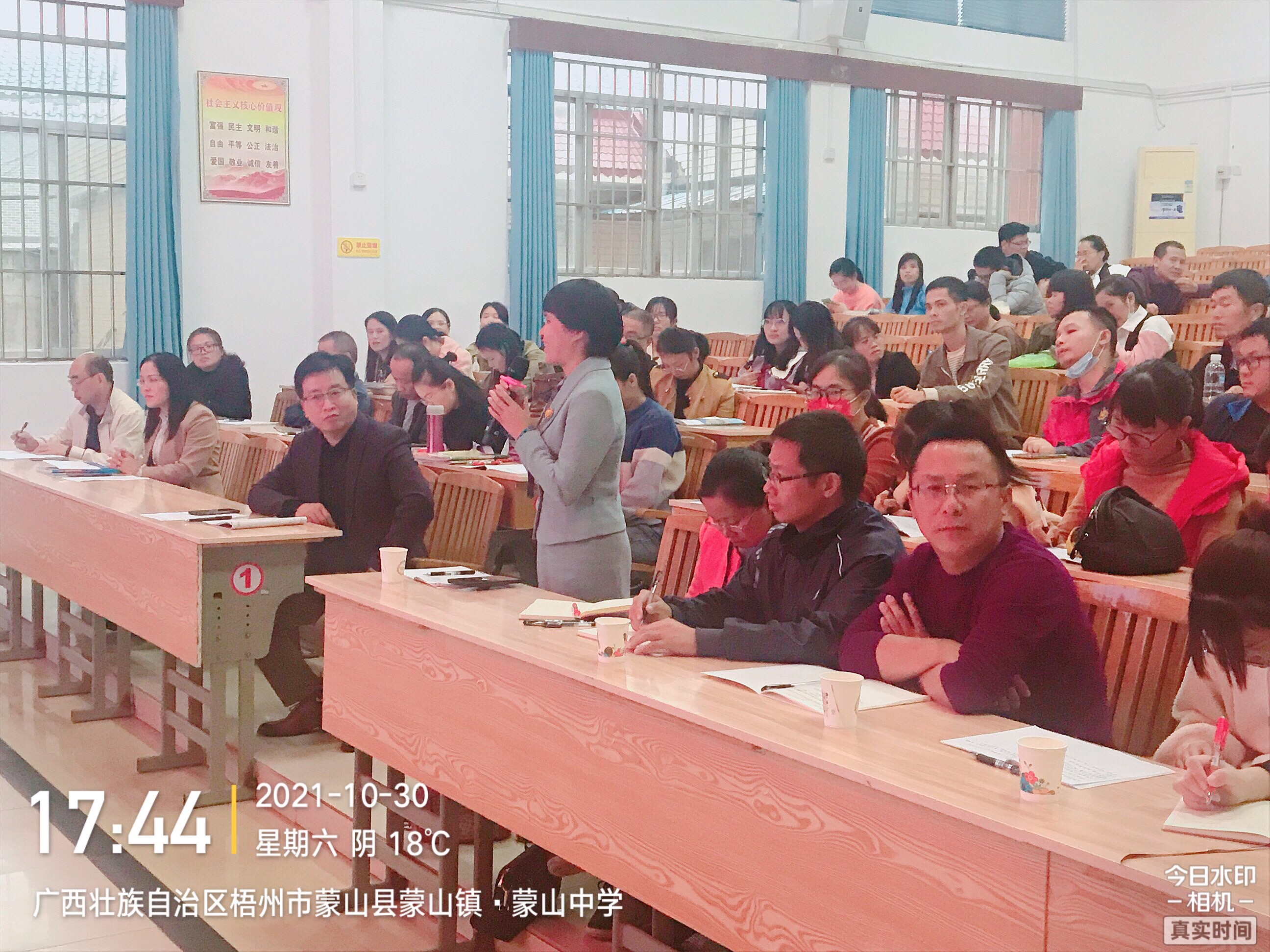鹿寨中學全校80多名高一老師認真聽課,做筆記。