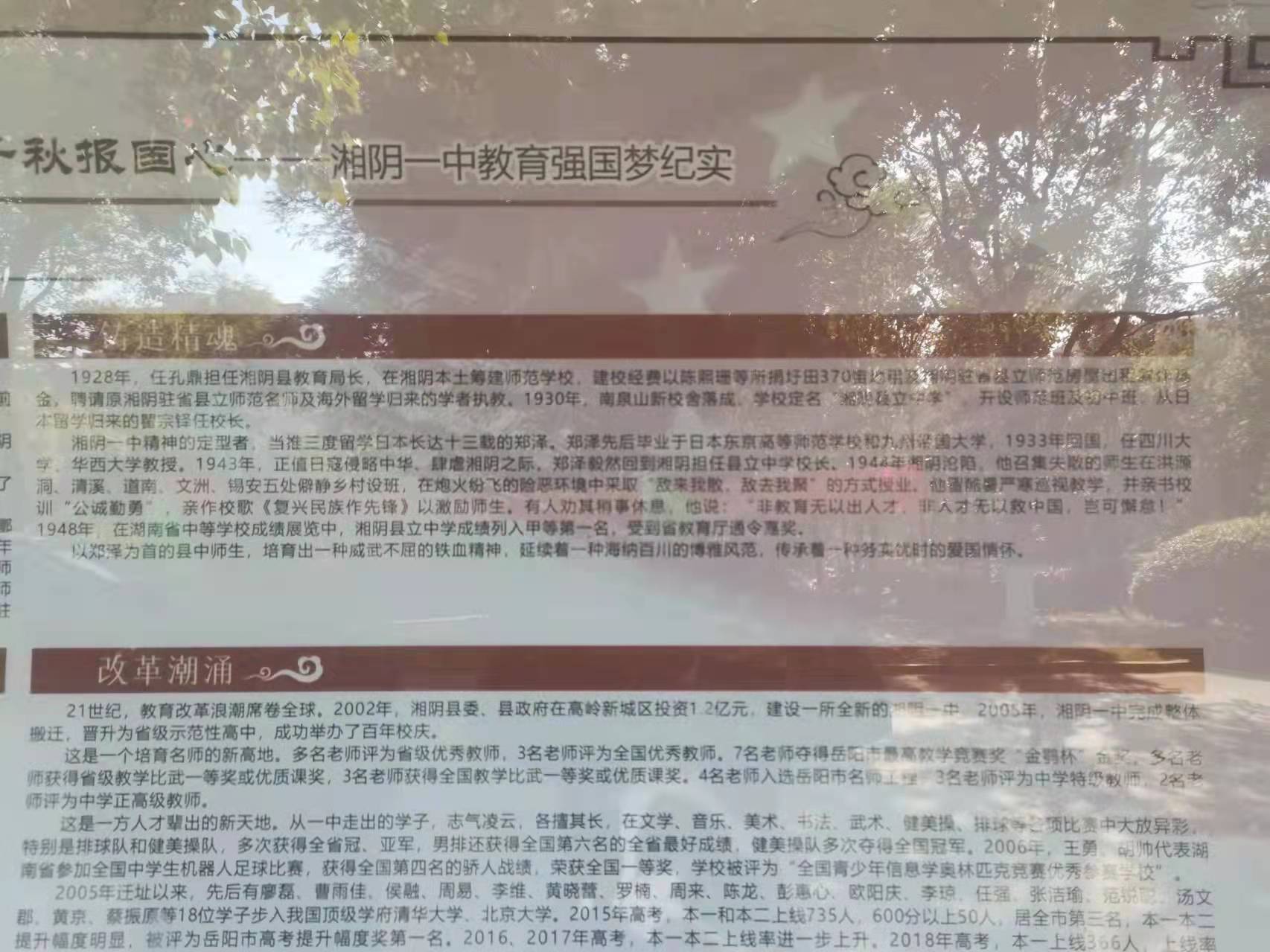 附:湘陰縣第一中學(xué)創(chuàng)建于1905年(清光緒32年),始稱"湘陰駐省中學(xué)"。當(dāng)時清政府詔示停止科舉考試,命各省會及府、州、縣籌設(shè)高等、中等、初等學(xué)堂。湘陰縣教育先輩陳炳煥、仇道南等率先興新學(xué),租賃長沙市南正街唐宅作臨時校舍,招收甲班學(xué)生80名。同年12月,購置長沙市北門口羅湘里周幾天房屋改作校舍。